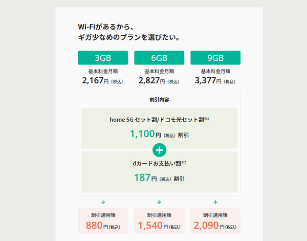 元の料金は「ドコモmini」の4GBは2750円(「irumo」の3GBは2167円)、10GBは3850円(同9GBは3377円)。ここからdカードGOLDやドコモ光、ドコモでんきの契約がセットの割引で、上記の金額になるので(割引額も全体に大きくなっている)、ドコモ光やドコモでんきを使わないなら値上げでしかない。