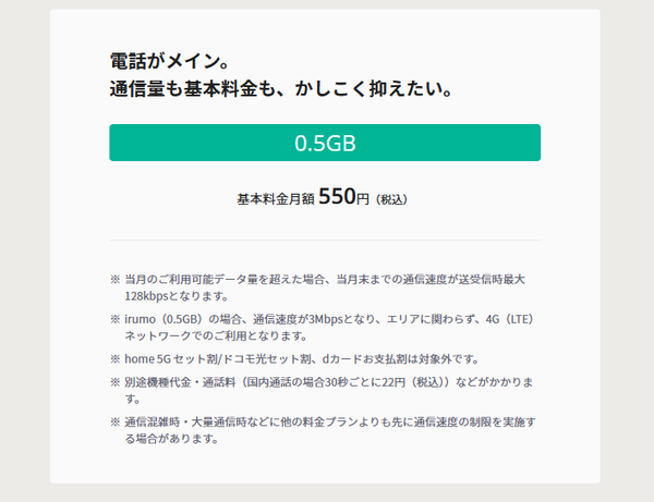「irumo」は「ドコモmini」に移行するが、4GBと10GBの2コースに集約される。「irumo」にあった月550円の0.5GBコースは回線の維持や着信専用で使うには好都合だったが、後継プランは無いのでそのままキープするしかない。