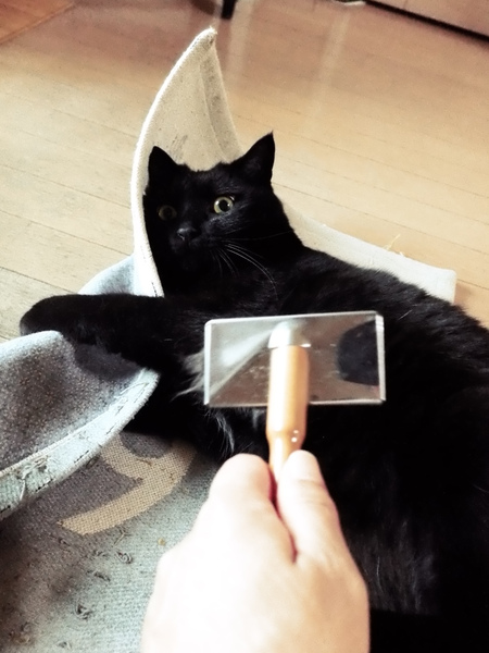 黒猫ついでにうちの黒猫も。マットを敷いてあるのだけど、ブラッシングしてやると気持ちよくてすぐマットをぐちゃぐちゃにしちゃうのだ。そんな臨場感を狙ってみた。