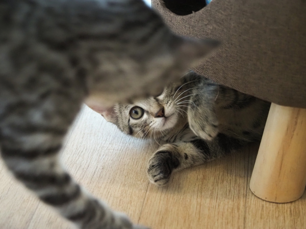 夏の午後、この2匹だけが駆けずり回ってる感じで、兄弟で一緒に保護されたため、ほかの猫が子猫タイフーンに巻き込まれなくてよかったねという感じ。