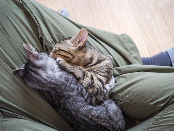 そして、しまいにはこんなことに。床にあぐらをかき、カメラを持って猫を目で追ってたら、なんと1匹がぴょんと飛び込んできて足の間に埋まってしまったのだ。ちなみに、バリアングルモニターなのをいいことに、モニターを開き、真上から撮っております。