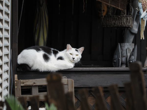 とある雨模様の日、バス停に向かって歩いていたら、右手の奥に白いヤツがいるではないか。雨が上がっていたので、傘をたたんで塀にたてかけ、バスの時刻をチェックし、まだ大丈夫だと望遠ズームレンズに付け替え、「あいつは何をやってるんだ?」という顔をしてる白黒猫を撮ったのがこちら。屋根の下のテラスみたいなところが定位置なようだ。