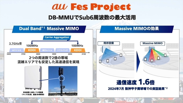 DB-MMUは、KDDIが持つサブ6の2つの周波数(サブ6で2つの周波数を持つのはドコモとKDDIだけ)を同時に活用することで(キャリアアグリゲーション)、通信速度を1.6倍に向上させるといった効果が実証されています(2024年7月の阪神甲子園球場での実証結果)。これにより、混雑エリアでも安定した高速通信が実現されます。同じ場所にたくさんの人が集まるフェスでも、通信が途切れたり速度が遅くなったりすることなくスマホが使えるので、最近のフェスでは欠かせません。