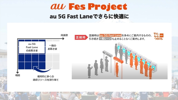 まずは通信環境の強化から。フェス会場での通信の安定性と速度は、参加者の体験を大きく左右します。auは最先端の技術を投入し、混雑時でも快適な通信を実現しています。それは最新車載型基地局の導入です。今年度から使われているDB-MMU(DualBand Massive MIMO)対応の最新車載型基地局(移動基地局)を2台設置し、昨年度までのSingle Band-MMUから進化しました。