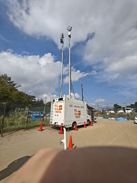 また、移動基地局はただ置いてあるだけではありません。会場の地形が「すり鉢状」であることを考慮し、ほかの通信事業者よりも会場に近いエリアに、地主から敷地を賃借して基地局を設置しています。これは、より会場の中心を狙い、ほかの場所では電波対策が不十分になる可能性があると判断されたためです。他社(ドコモ、ソフトバンク、楽天モバイル)は同じ駐車場内に設置しています。ドコモ、ソフトバンクも2台設置しており、楽天モバイルは1台でした。