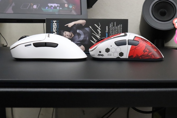 通常サイズのエルゴノミクス形状マウス「Pulsar Xlite v4 Medium」(右)との比較。ちょっとわかりにくいですが、Pro Series JV-Xのハンプ形状は高さが抑えられてゆるやかな傾斜に見えます