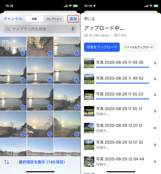 Dropboxモバイルアプリのホーム画面や、画面下の「+」ボタンで開くメニュー画面には、「写真をアップロード」というボタンがあります。これをタップすると、スマホに保存された写真の一覧が表示されますので、写真/ビデオを1つずつタップしてチェックマークを入れていきます。最後に「追加」をタップし、アップロード先(フォルダ)を選択すれば、アップロード処理が始まります。