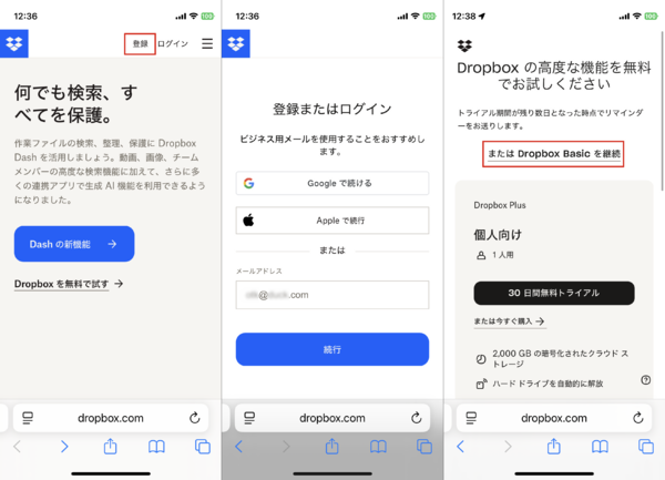Dropboxを初めて利用する場合は、アカウント作成が必要です。スマホのWebブラウザでdropbox.comにアクセスし、「登録」のページで、既存のGoogle/Appleのアカウントにひも付けるか、新たにメールアドレスと名前、パスワードを入力してアカウントを作成します。